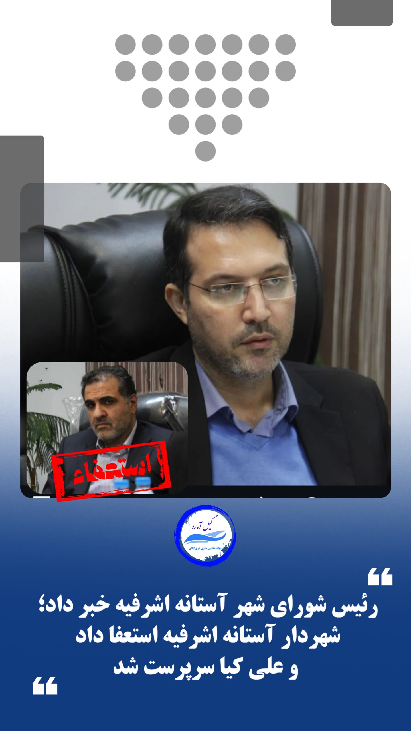 وحید قربانی رئیس شورای شهر خبر: صبح امروز در جلسه شورای اسلامی شهر آستانه اشرفیه، «عبدالحسین داداشی» شهردار این شهر، استعفا داد که با موافقت اعضای شورای شهر را به دنبال داشت، و در این جلسه علی کیا به عنوان سرپرست شهرداری آستانه اشرفیه منصوب شد.