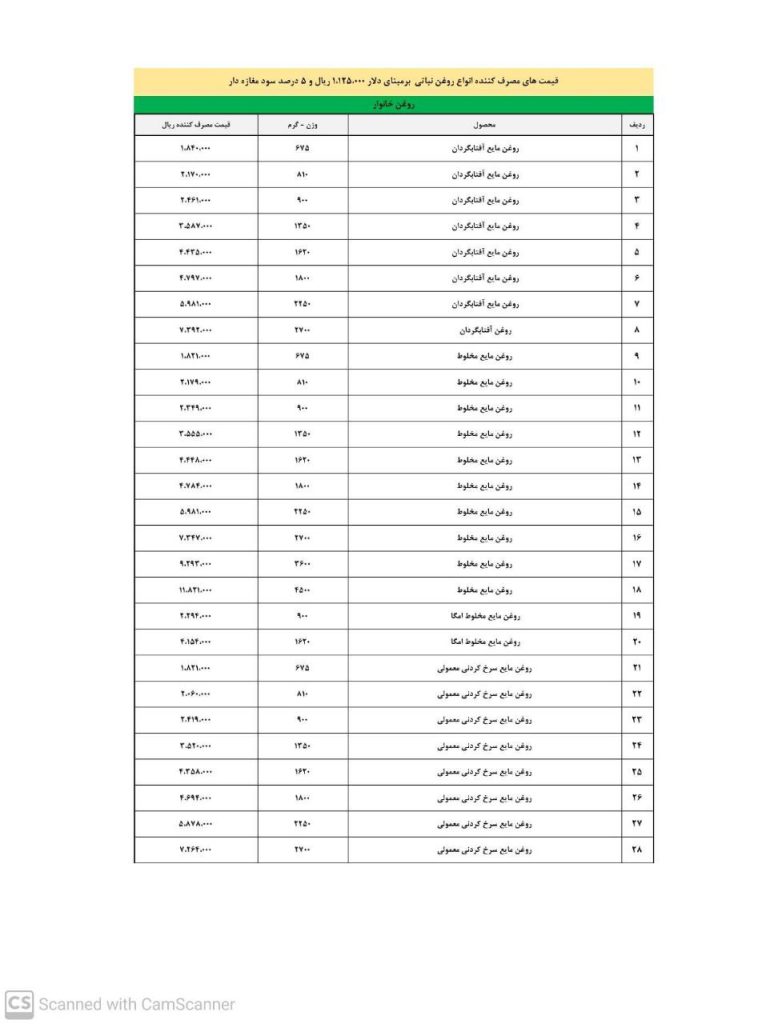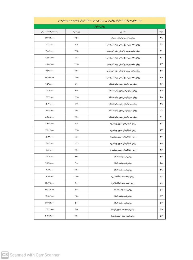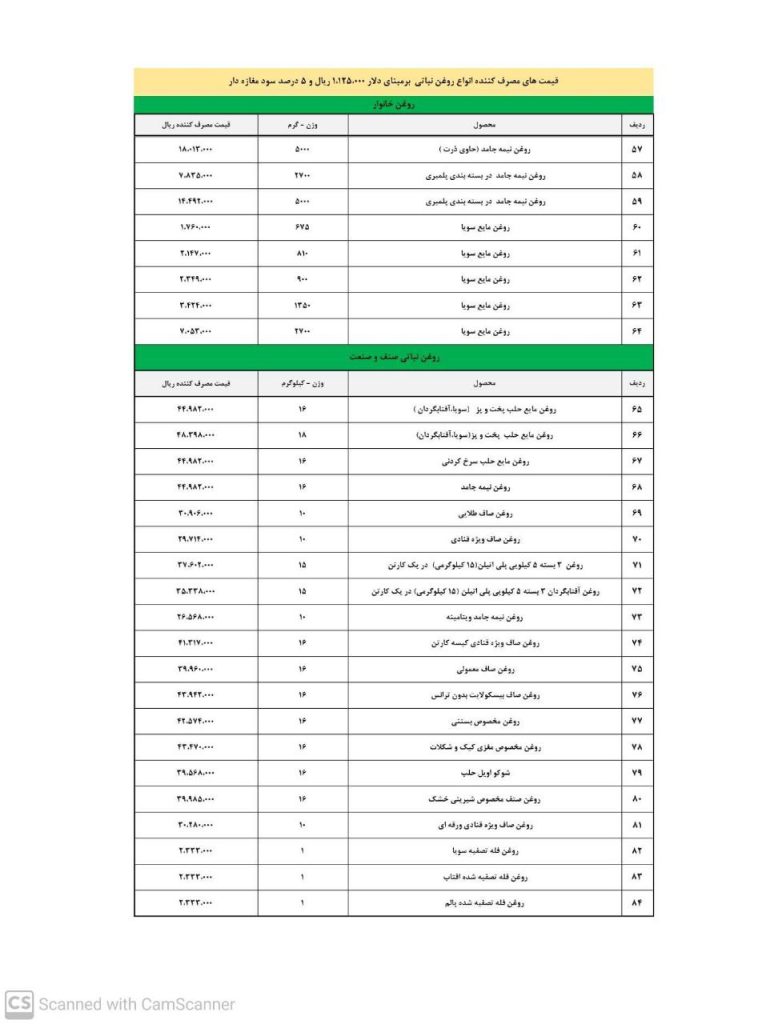در این فهرست قیمت ۸۴ قلم روغن خوراکی اعلام شده که در آن قیمت روغن ۸۱۰ گرمی ۲۱۷ هزار تومان قید شده است.