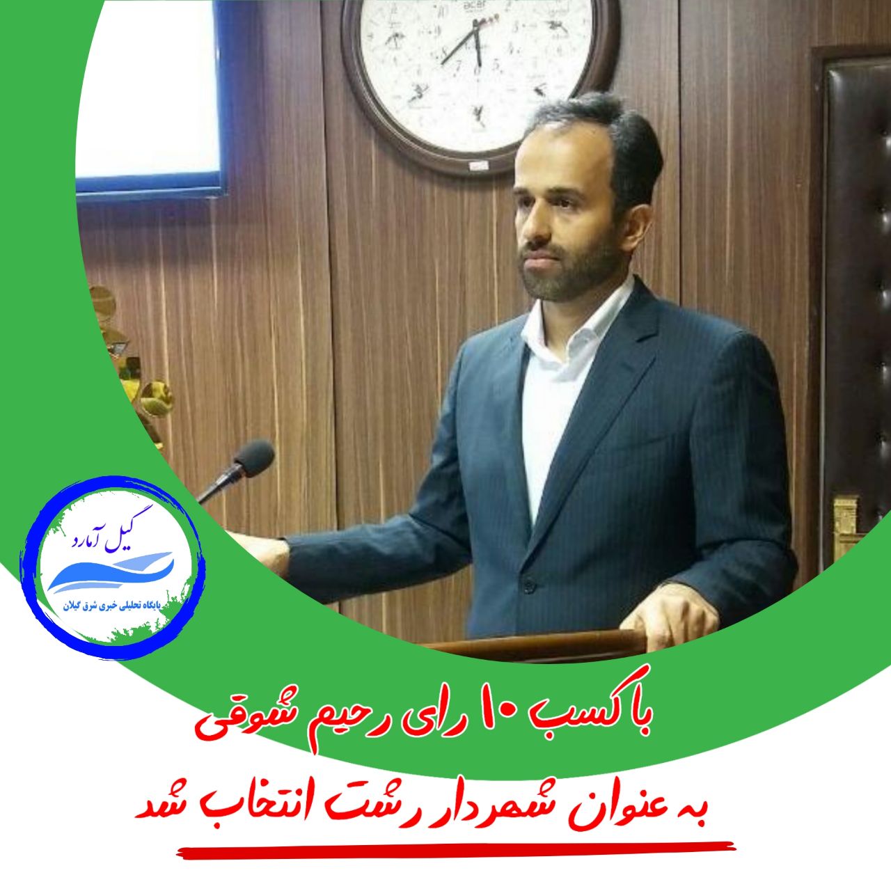 عصر امروز هفتاد و هفتمین جلسه شورای شهر رشت با حضور اعضای شورا و با دستور کار انتخاب شهردار رشت برگزار شد و «رحیم شوقی» توانست با 10 رای اعضای شورا شهر ، به عنوان عنوان شهردار رشت انتخاب شود.