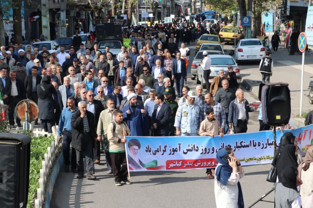 گیل آمارد: همزمان با سراسر کشور، مراسم راهپیمایی یومالله ۱۳ آبان با حضور پرشور دانشآموزان، مسئولین و عموم مردم انقلابی در بندرکیاشهربرگزار شد. شرکتکنندگان در این مراسم با سر دادن شعار انزجار خود را از استکبار جهانی اعلام کردند.